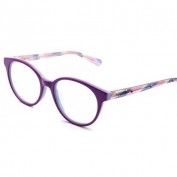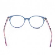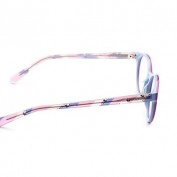 Modelo: Niña Color gafa: combinación en la parte frontal de tricolor: lila, rosa y azul turquesa por la parte interior. Varillas con estampado personalizado en los tonos del frontal de la montura. Forma: Redonda – ovalada Material: Acetato Medidas: 45-16-130